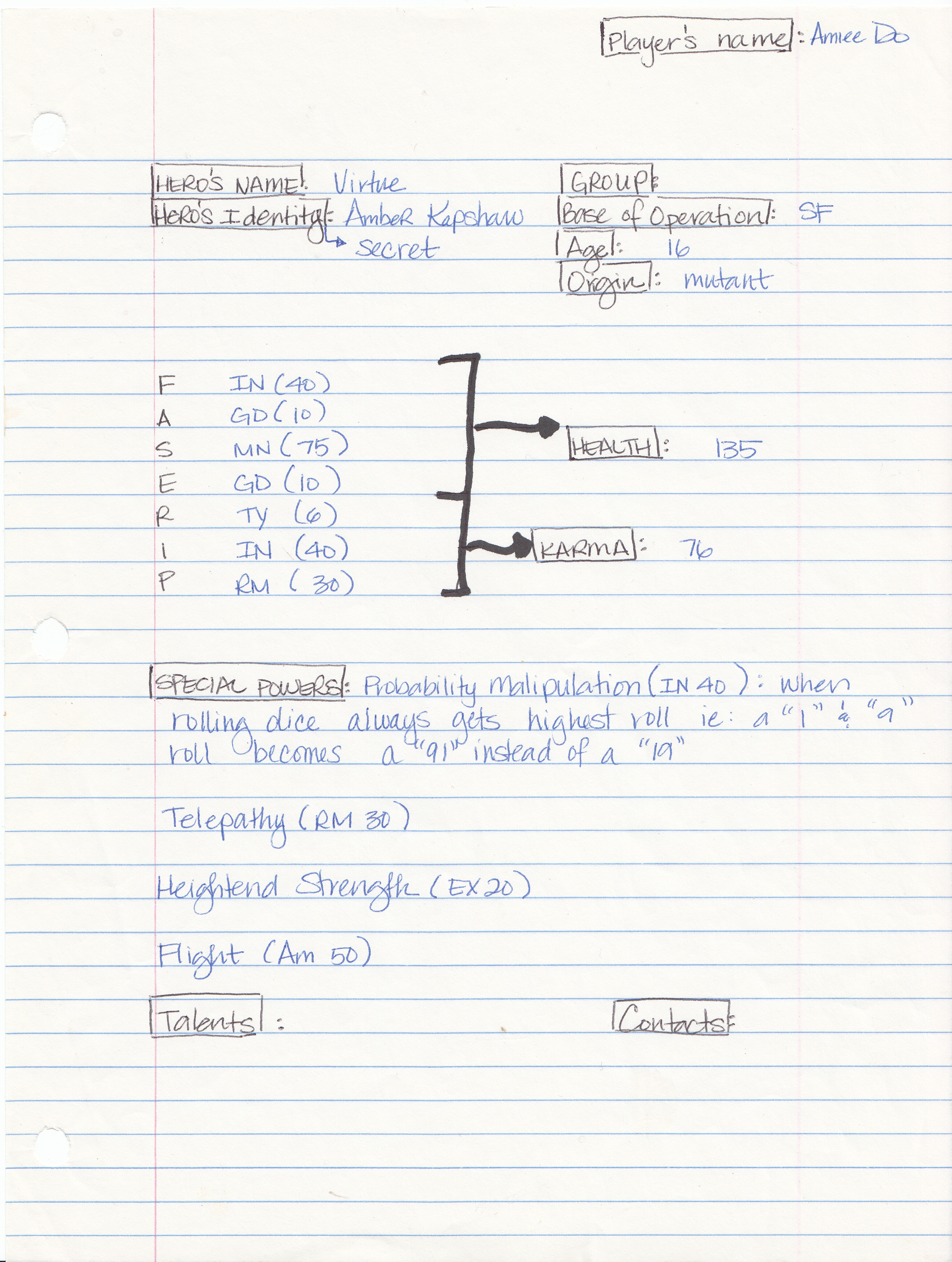 Was talking to one of my D&D players, and how they’d listened to our latest podcast (shout out to Ben Abell) – and we discussed cartoons and Amiee’s lack of watching them – but I did say she was familiar with the X-Men and even played the Marvel RPG. This character sheet is OVER 20 years old because it predates me and her being married!